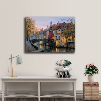 SCENERY CROSS STITCH EMBROIDERY ART – SUNSET GLOW HOUSE & BRIDGE FRAMELESS CANVAS