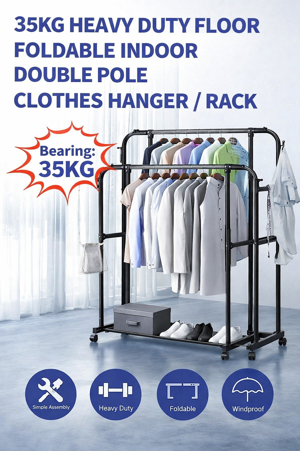 35KG HEAVY DUTY FLOOR FOLDABLE DOUBLE POLE CLOTHES HANGER RACK
