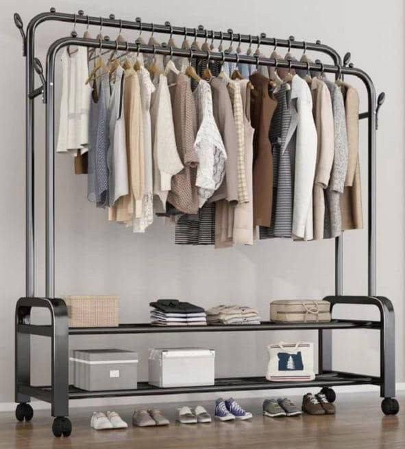 • A floor folding indoor double pole clothes hanger for hanging clothes in a bedroom. A simple cooling rack for household usage