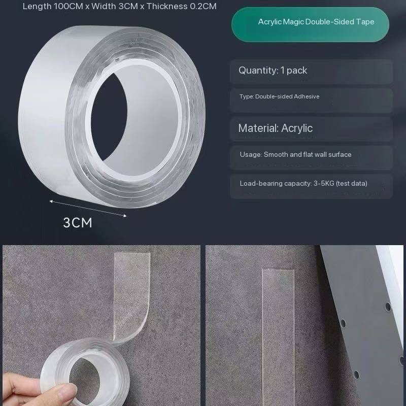 Mount items neatly without nails or drilling. This strong, clear acrylic tape gives firm hold on smooth surfaces while staying traceless when removed — no damage, no residue.