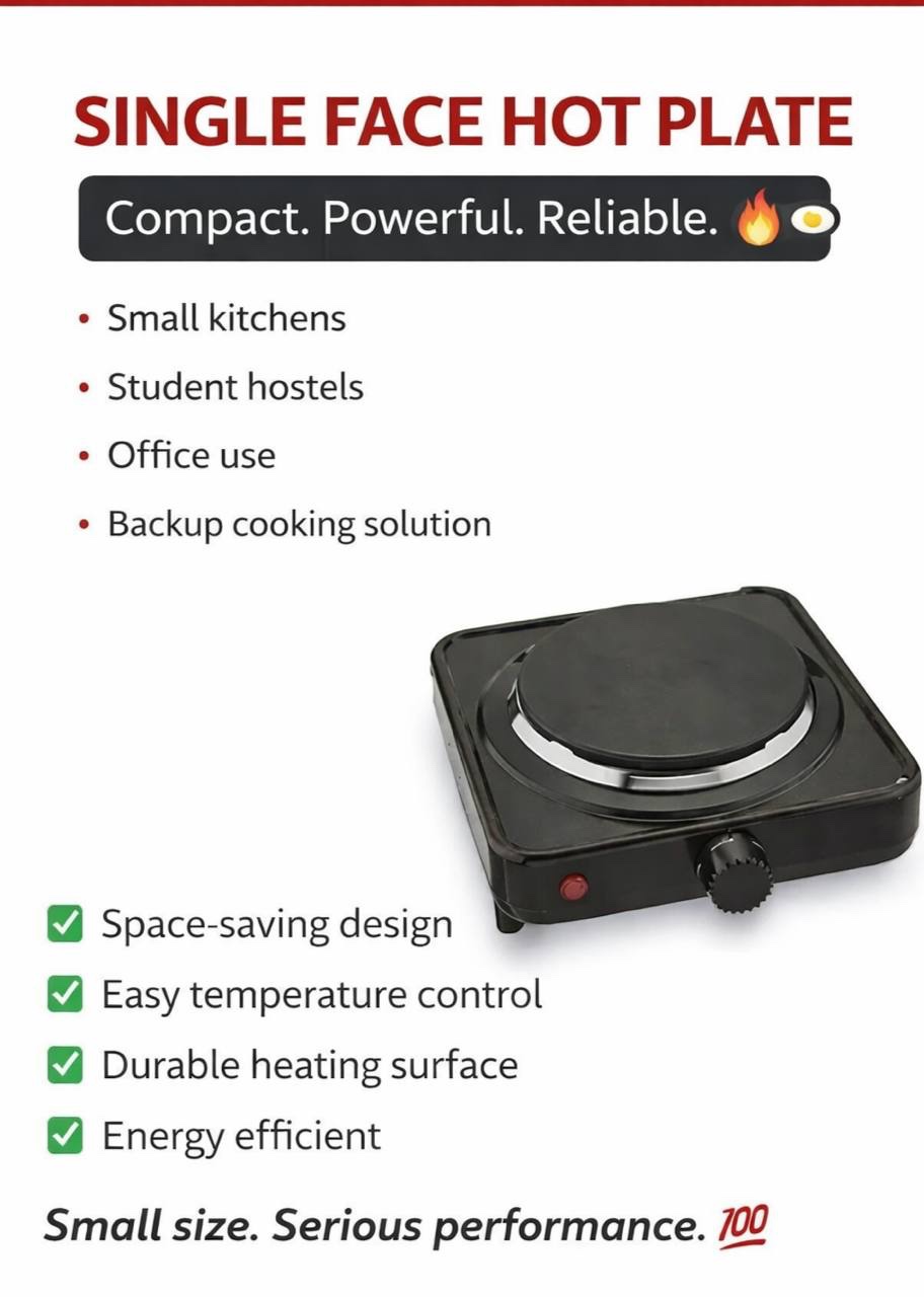This Single Face Hot Plate delivers steady heat for fast and efficient cooking. Whether you’re boiling, frying, or warming meals — it gets the job done with ease.